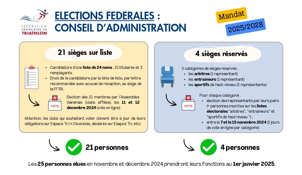 • Si vous êtes licencié, majeur et titulaire d’un BF niveau 3 ou 4 ou d’une Licence STAPS, spécialité “triathlon” ou d’un DEJEPS spécialité “perfectionnement sportif”, mention “triathlon et disciplines enchaînées”, vous pouvez participer à l’élection du représentant des entraîneurs en vous inscrivant sur la liste électorale correspondante