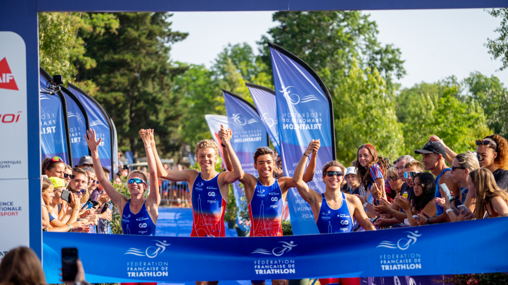 Chez les plus jeunes des Triathlètes, c’est l’équipe 1 de la Ligue Nouvelle-Aquitaine qui a remporté le titre. Elle était composée par ordre de relais de Vincent Gahery, Juliet Treille, Jasper Gervoson et d’Odri Guryanova. Cette dernière était déjà titrée la veille en individuel. L’Île-de-France termine à la 2e place à 20 secondes devant les Hauts-de-France, qui grimpent sur la dernière marche du podium à 2’26.