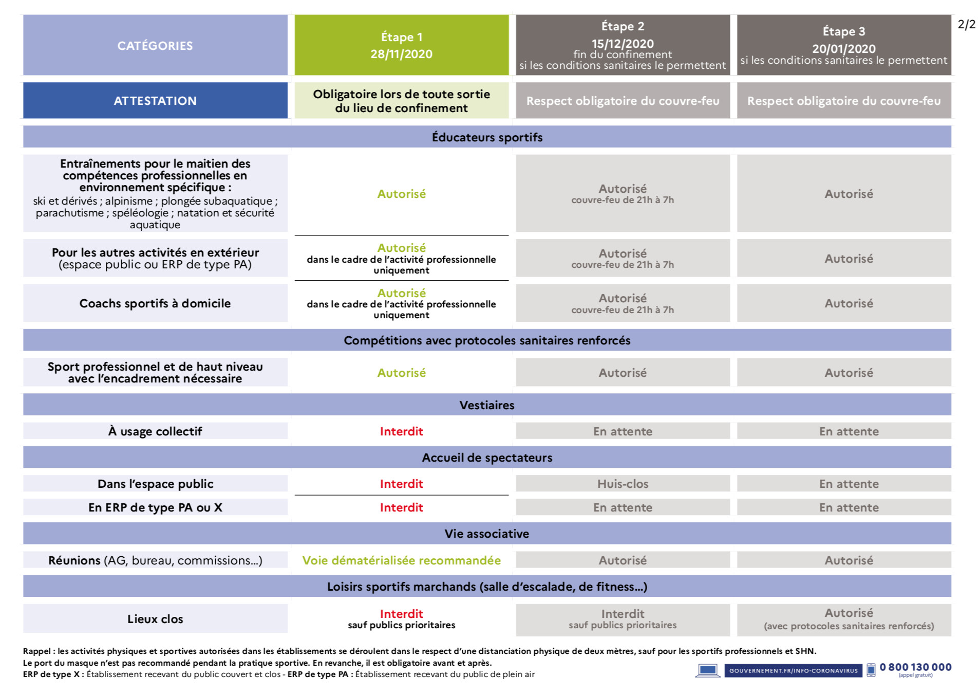 Suite aux annonces du Président de la République et du Premier ministre, Jean-Michel BLANQUER, ministre de l’Education nationale, de la Jeunesse et des Sports et Roxana MARACINEANU, ministre déléguée en charge des Sports, précisent les nouvelles mesures sanitaires pour le sport qui entrent en vigueur à partir du samedi 28 novembre 2020.