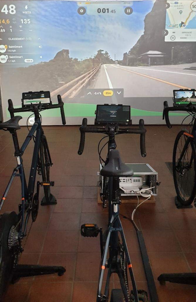 Concrètement, il s’agit d’une salle de home-trainers connectés couplés à un dispositif de vidéo projection professionnel pour une expérience de téléportation sportive.