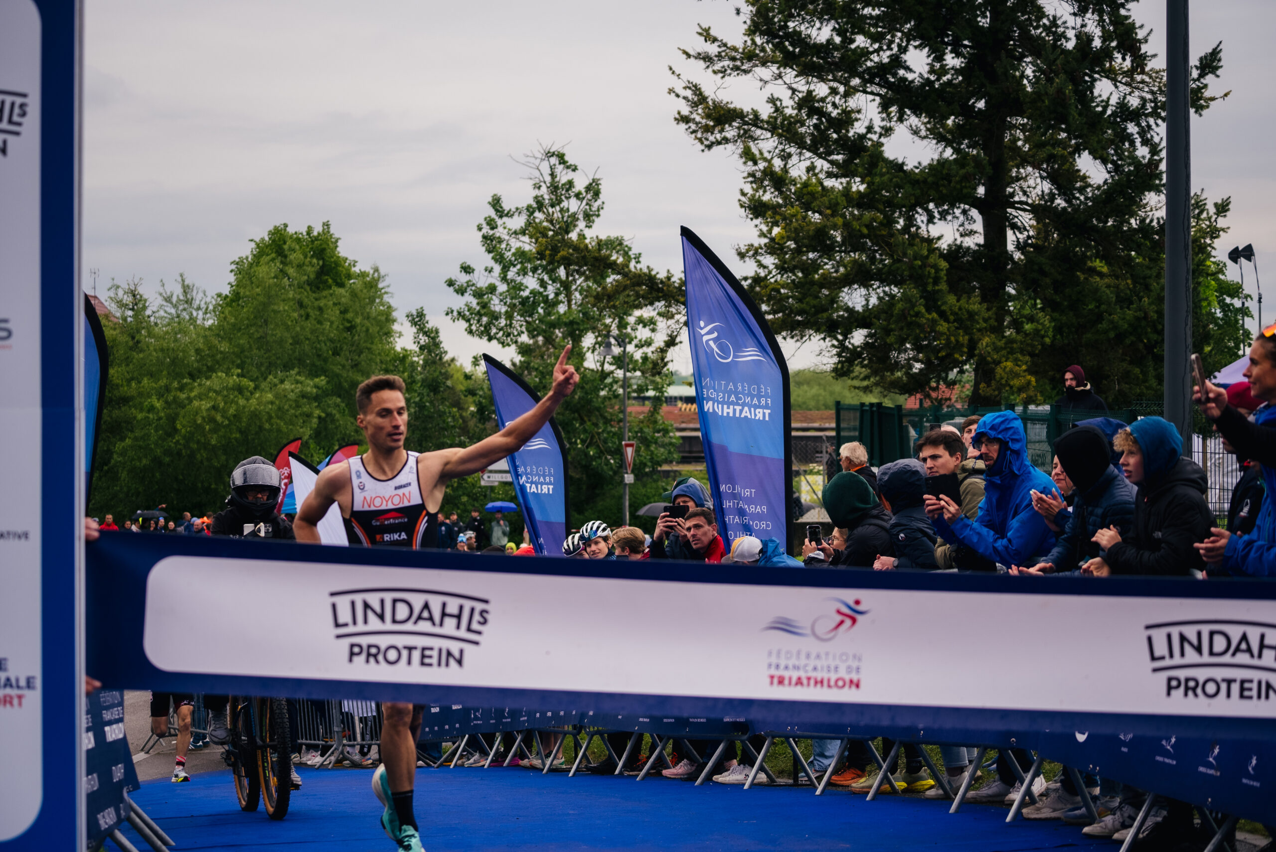 Le départ vélo, dans une côte à 6% provoque des cassures et un groupe de 12 prend finalement la tête. On y retrouve notamment Léo Starck, Valentin André, Thomas Gillodts et Baptiste Cartieaux pour les Tritons Meldois, Adrien Pilleux et Arnaud Dely pour l’ESMGO, Javier Martin et Émile Blondel Hermant pour le Team Noyon Triathlon et le champion de France, Thomas Laurent pour Évreux AC.