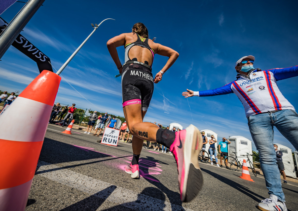 C’est cinq minutes avant les hommes que les femmes ont pris le départ de ce Championnat de France de Triathlon Longue Distance à Cagnes-sur-Mer. La première à sortir de l’eau est Julie Iemmolo (TCG 79 Parthenay) suivie par Justine Guerard (Triathlon Club de Lievin) à 14 secondes et Justine Mathieux (Chambéry Triathlon) à 28 secondes.