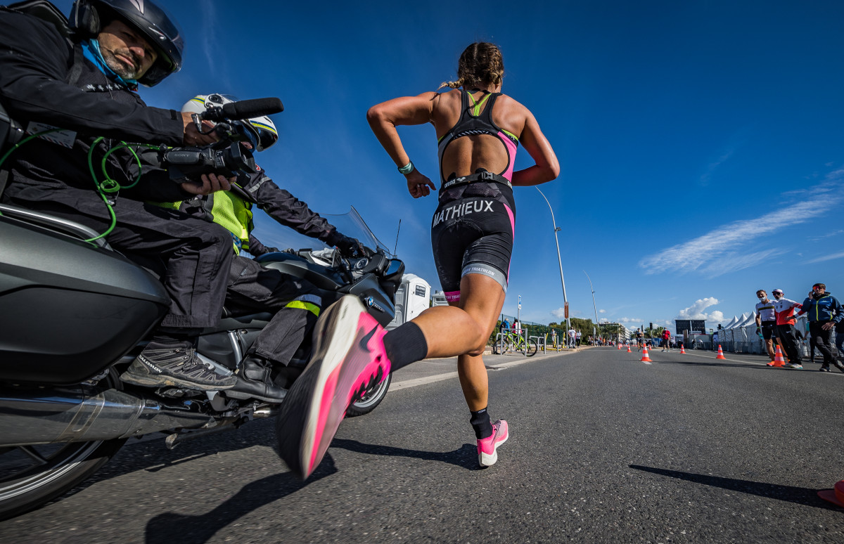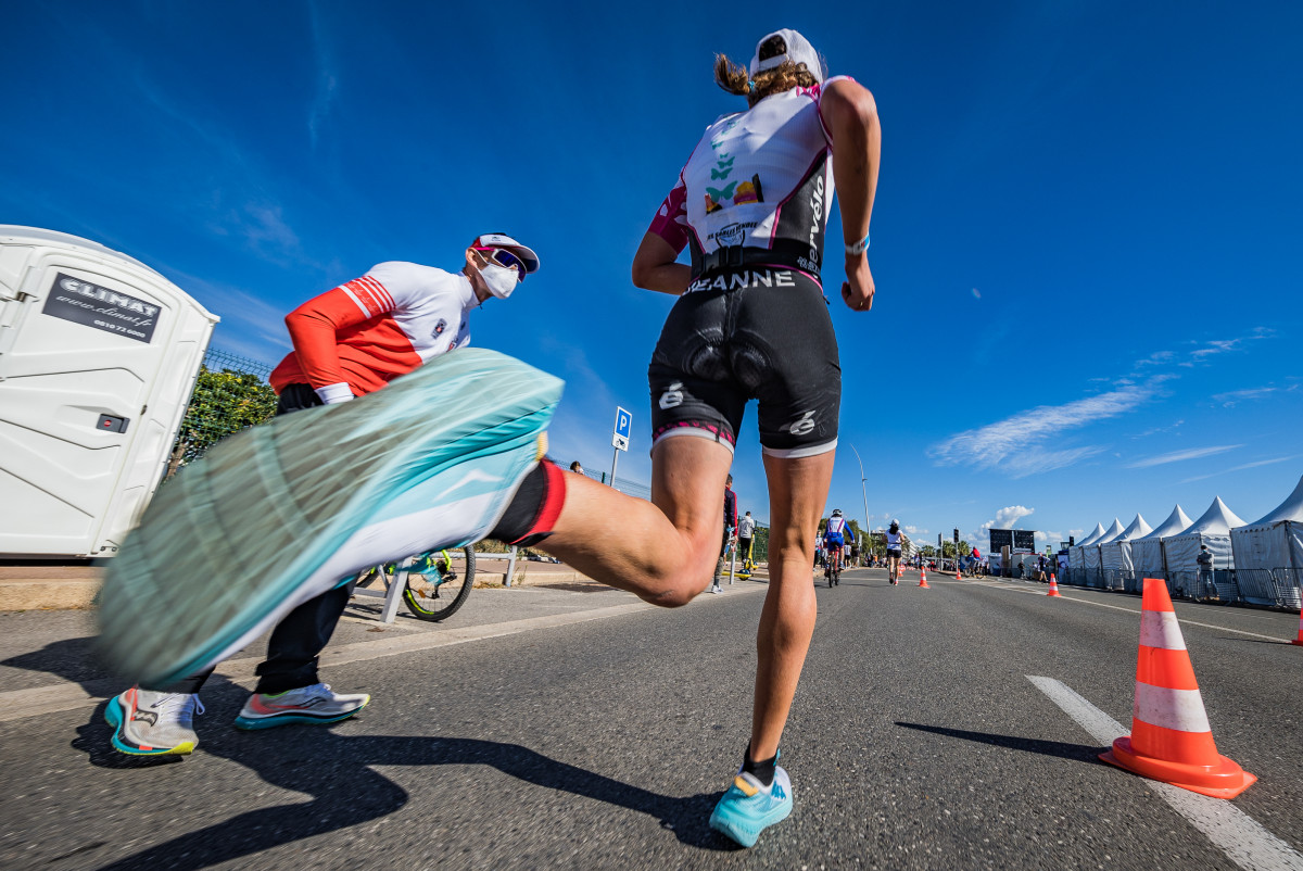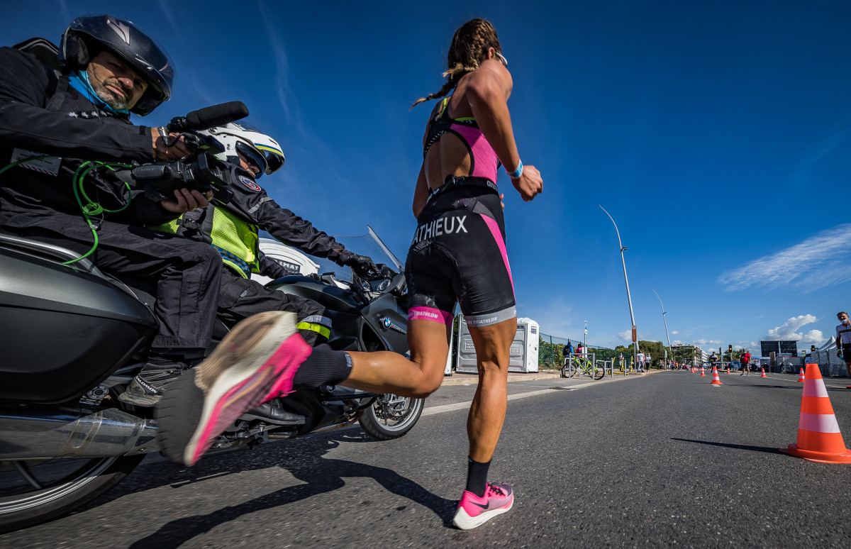 Sur le parcours vélo, Jeanne Collonge (Les Sables Vendée Triathlon), Championne de France de Triathlon longue distance, à Calvi en 2012 revient sur la tête de course. Elle est la première à poser le vélo avec 1’40’’ sur Justine Mathieux (Chambéry Triathlon) qui perd du temps en T2. Julie Iemmolo (TCG 79 Parthenay) tient quant à elle la 3ème place.