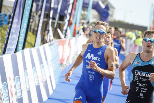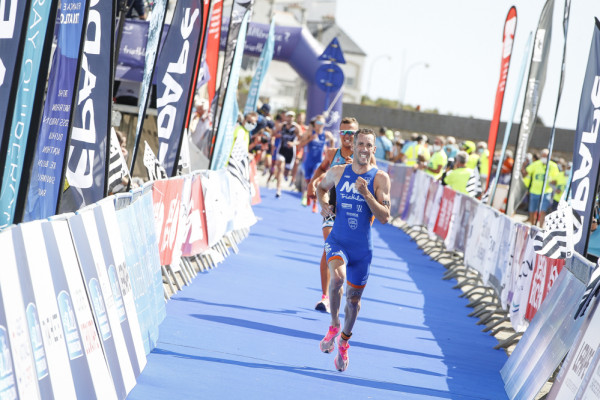 Depuis le départ des Femmes, 1h30 a passé et la marée a eu le temps de remonter un peu sur la Grande Plage de Quiberon mais probablement pas assez au goût des athlètes. Côté combinaison, même choix que pour leurs homologues féminines, ils l’ont tous gardée. 8’57 suffiront à Richard Varga (Triathlon Club Liévin) et Nathan Lessmann (Triathlon Toulouse Métropole) pour réaliser les 750m de natation. La concurrence est rude et c’est un flot continu d’athlètes qui court derrière eux vers l’aire de transition. Les 8 hommes qui s’élancent pour former le premier groupe semblent clairement déterminés à faire le trou. Deux Liévinois accompagnent les deux meilleurs nageurs, le Suisse Salvisberg et l’Espagnol Noya, ainsi que les athlètes de Poissy Triathlon, Aurélien Raphaël et Tom Richard, Louis Vitiello (Saint Jean-de-Monts-Vendée Triathlon) et Arnaud de Boscs (Sainte Geneviève Triathlon).