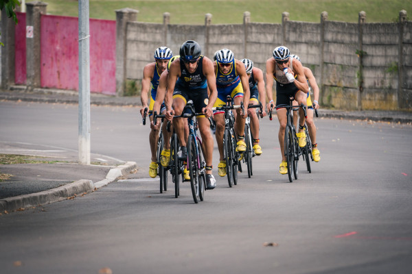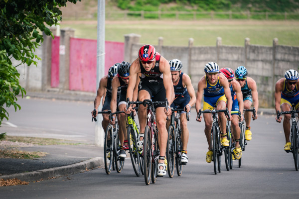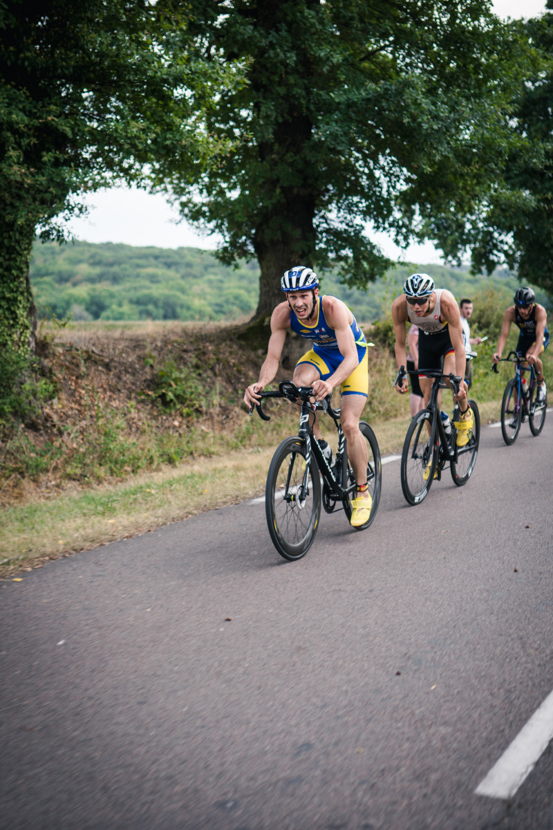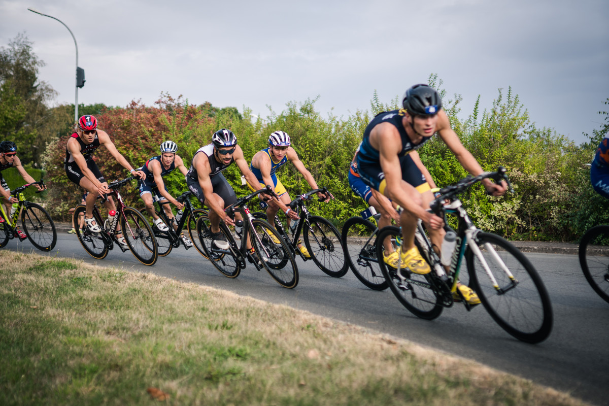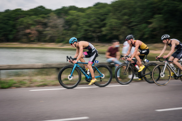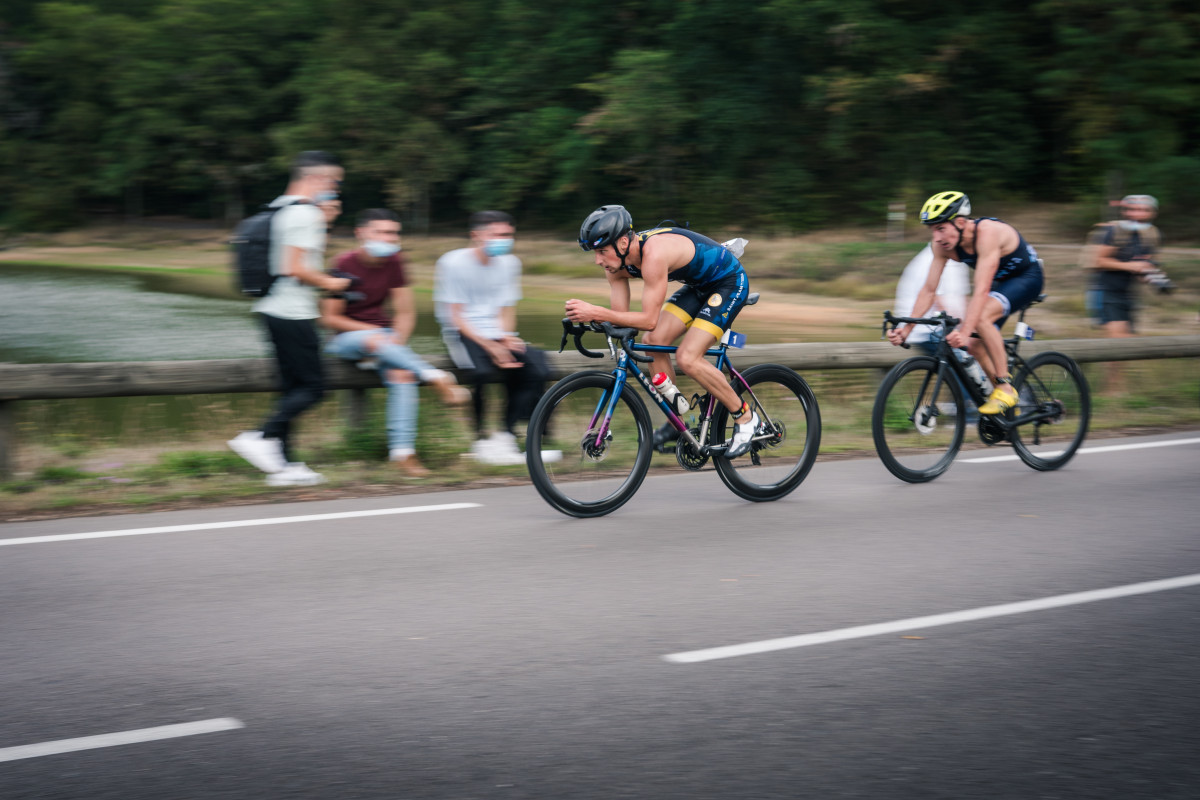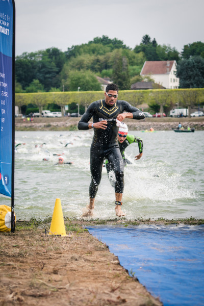 Les conditions n’ont pas évolué pendant l’après-midi et nos triathlètes masculins, plus que prêts, s’élancent avec deux minutes d’avance dans le lac du Plessis. Difficile cependant d’évaluer qui a le mieux réussi son entrée dans l’eau et il nous faudra attendre la sortie d’eau pour voir se confirmer notre intuition que les grands bras moulinant en tête appartiennent bien à Aurélien Raphaël, le champion de France en titre. Il est suivi de près par l’allemand Jonas Schomburg puis émergent 6 secondes plus tard Pierre Le Corre et Léo Bergère, le premier U23 Nathan Lessmann, Dorian Coninx, le belge Noah Servais et Tom Richard. Le début de la course vélo se fait offensive avec une longue tentative d’échappée de Schomburg, tout d’abord accompagné de Raphaël mais qui décroche dans le premier tour et se voit rattraper par le trio Bergère - Le Corre - Coninx. Servais, Richard et le Suisse Sylvain Fridelance, qui les a rattrapé alors que Lessmann décrochait de son côté, réussissent ensemble à recoller au groupe et c’est en travaillant ensemble que les huit hommes vont creuser l’écart avec leurs poursuivants.