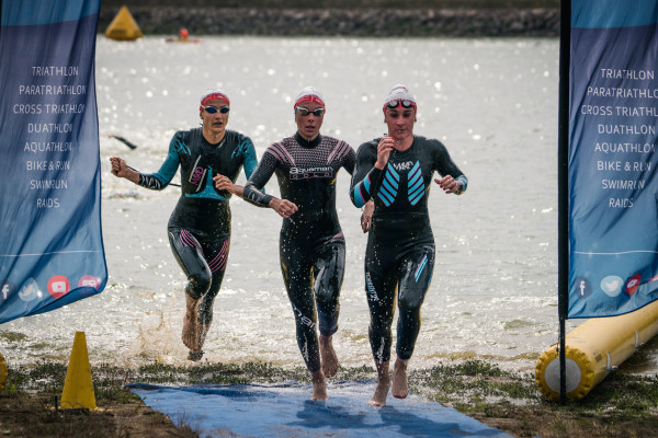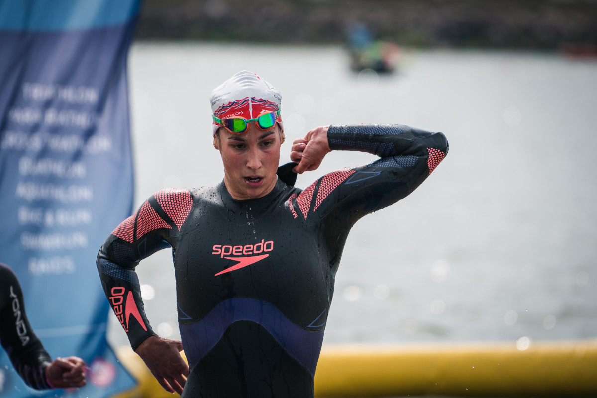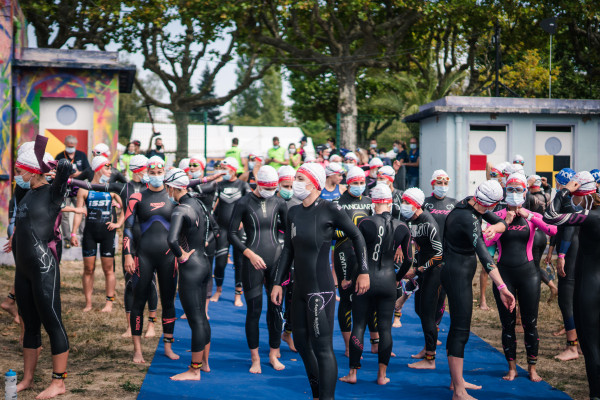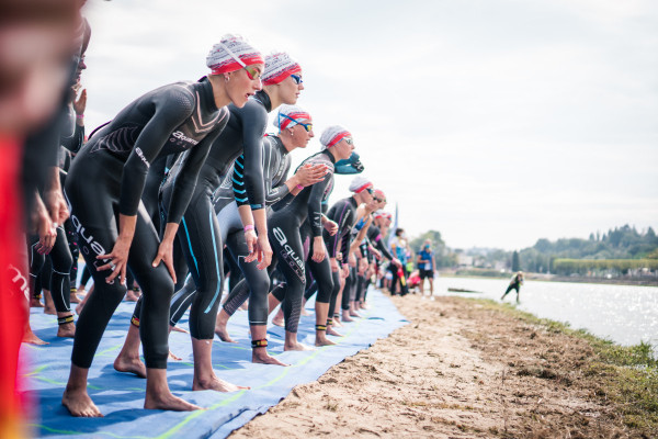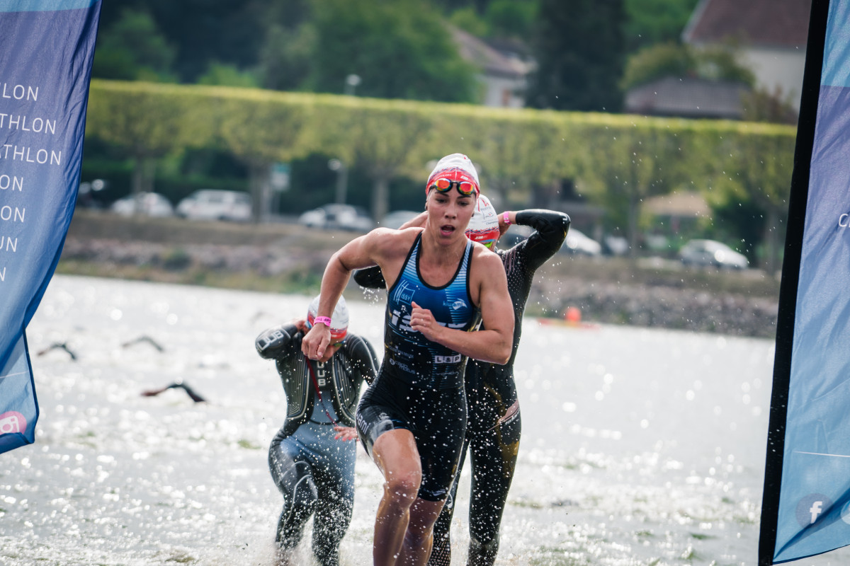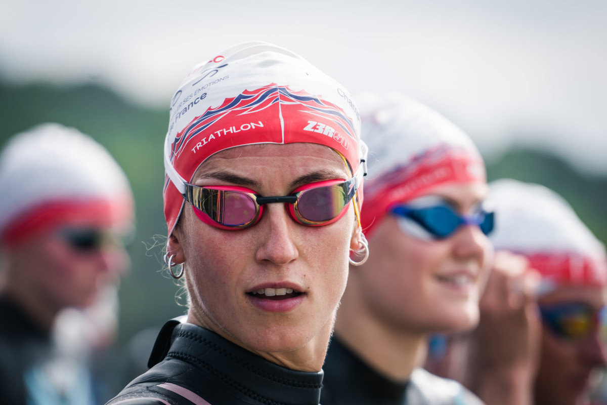 C’est à 13h05, après un réajustement de bouée que le vent avait quelque peu dérouté, que le départ des athlètes féminines, seniors et masters confondues, a été donné. L’eau ayant été mesurée à 21 degrés, la combinaison est simplement autorisée. Toutefois, sur les 63 athlètes présentes sur la ligne, seules cinq, dont Celia Merle, ont pris le parti osé de laisser la combinaison dans le sac. Cassandre Beaugrand fait une superbe entrée dans l’eau et prend nettement les devants sur cette partie natation. Suite au passage de la première bouée, ce n’est pas le vent de face qui la freine et ses poursuivantes continuent de suivre son sillage. La sortie d’eau nous fait découvrir la nageuse Lea Marchal sur ses talons, suivie par un groupe de quatre composé de Emilie Morier, Margot Garabédian, Léonie Periault et Kristelle Congi. Beaugrand perd un peu de temps à la transition et est rejointe par Periault sur les premiers mètres du parcours vélo. Au début de la bosse, les deux coureuses de Poissy Triathlon ont quelques secondes d’avance sur un groupe de huit composé des athlètes citées précédemment ainsi que d’Audrey Merle, Margot Garabédian, Lea Coninx, Pauline Landron et Mathilde Gautier.