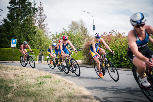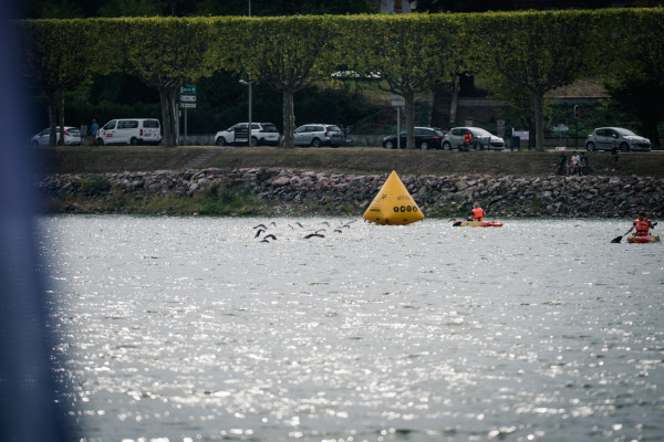Les conditions n’ont pas évolué pendant l’après-midi et nos triathlètes masculins, plus que prêts, s’élancent avec deux minutes d’avance dans le lac du Plessis. Difficile cependant d’évaluer qui a le mieux réussi son entrée dans l’eau et il nous faudra attendre la sortie d’eau pour voir se confirmer notre intuition que les grands bras moulinant en tête appartiennent bien à Aurélien Raphaël, le champion de France en titre. Il est suivi de près par l’allemand Jonas Schomburg puis émergent 6 secondes plus tard Pierre Le Corre et Léo Bergère, le premier U23 Nathan Lessmann, Dorian Coninx, le belge Noah Servais et Tom Richard. Le début de la course vélo se fait offensive avec une longue tentative d’échappée de Schomburg, tout d’abord accompagné de Raphaël mais qui décroche dans le premier tour et se voit rattraper par le trio Bergère - Le Corre - Coninx. Servais, Richard et le Suisse Sylvain Fridelance, qui les a rattrapé alors que Lessmann décrochait de son côté, réussissent ensemble à recoller au groupe et c’est en travaillant ensemble que les huit hommes vont creuser l’écart avec leurs poursuivants.