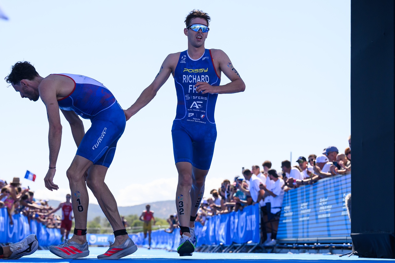 Le leader du classement général et placé logiquement parmi les favoris du jour, Matthew Hauser (AUS) est le premier à sortir de l’eau avec le Hongrois Mark Devay. Pour les Français, les deux pensionnaires de Poissy Triathlon, Dorian Coninx et Tom Richard sortent 7e et 8e. Yanis Seguin (Triathlon Club Liévin) arrive quelques secondes derrière, tout comme Pierre Le Corre (Les Sables Vendée Triathlon).