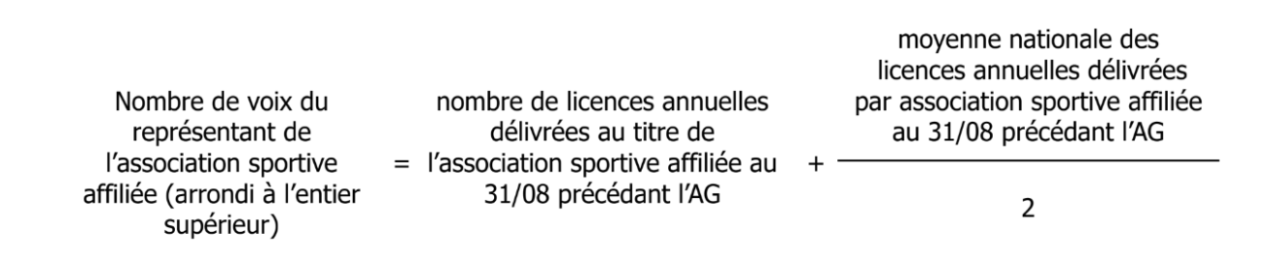 - à minima 40% des voixpour les Assemblées Générales Ordinaires (approbation des comptes, adoption du budget prévisionnel, validation des cotisations clubs, …) et les Assemblées Générales Extraordinaires (adoption des modifications statutaires)