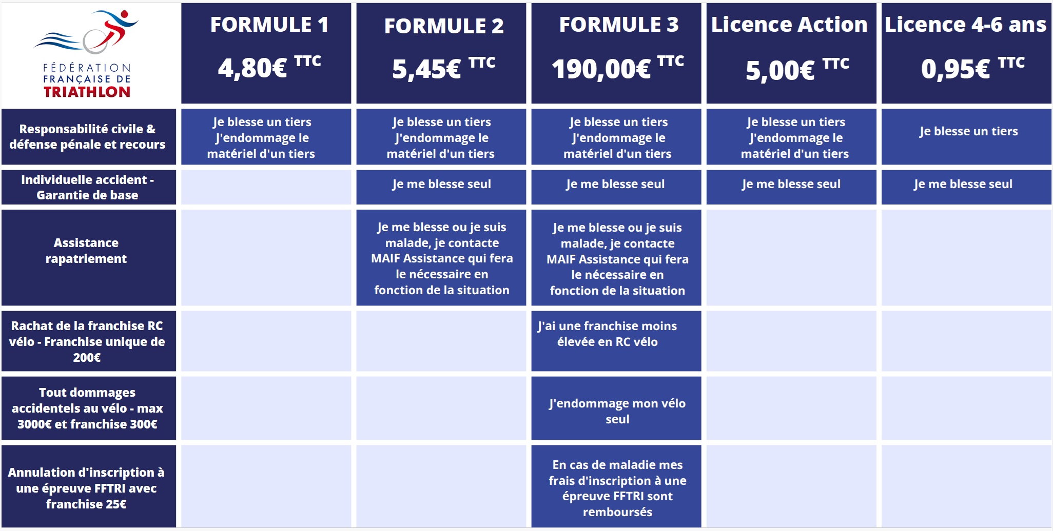 La prise de licence FFTRI propose trois niveaux de souscription d’assurances possibles, allant de la garantie minimale obligatoire responsabilité civile (formule 1) jusqu’à la garantie Individuelle Accident, rapatriement et dommages au vélo (formule 3), qui renforce la couverture du pratiquant notamment pour ce qui concerne les frais d’annulation et les dommages au vélo.